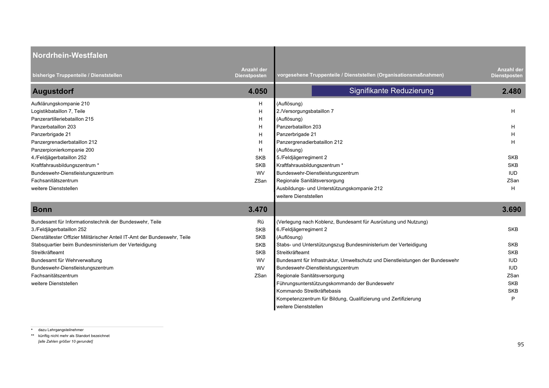 Weiter wird es Umstrukturierungen der verbleibenden Truppenteile und Dienststellen geben, die teilweise auch mit Reduzierungen der Dienstposten verbunden sein werden. Den offiziellen Bericht kann man hier einsehen.